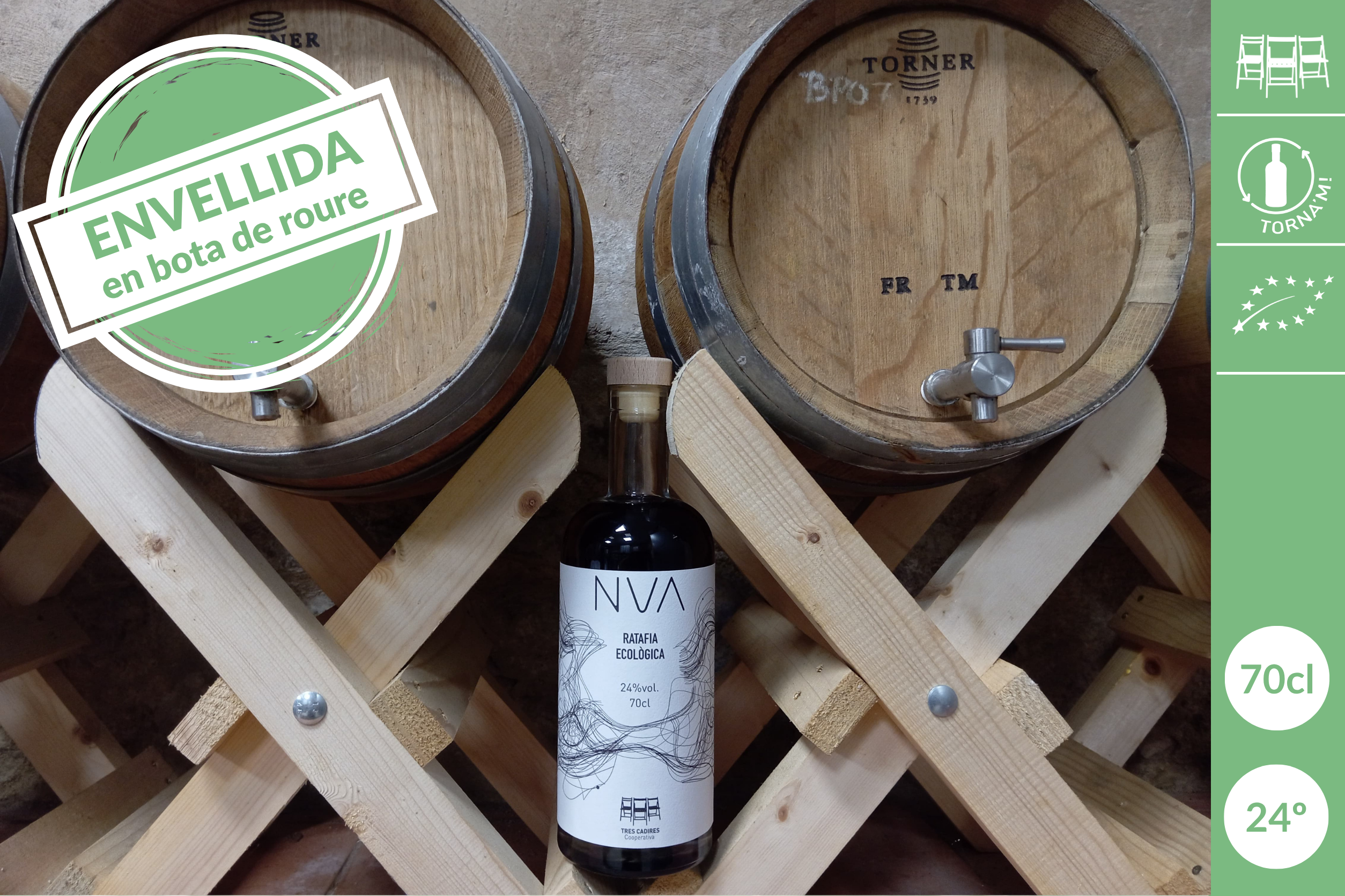 Envejecida durante tres meses en barrica de roble, donde previamente se había envejecido whisky. Una ratafía artesana ecológica con esencia de Arbeca y el matiz de la propia madera que la redondea en boca.